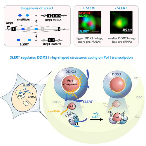 图注:SLERT的加工产生以及其与DDX21环、RNA聚合酶Pol I的相互作用机制