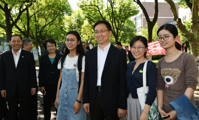 步行途经之处,韩正向所遇青年学子们颔首致意,还与部分同学合影留念。