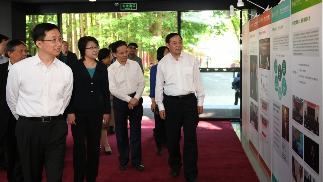 韩正一行随后来到中法中心,参观了主题为“百年深根、十载新绿”2007-2017同济大学办学成就图片展,听取学校近年来改革发展情况介绍。最后,韩正主持召开座谈会。
