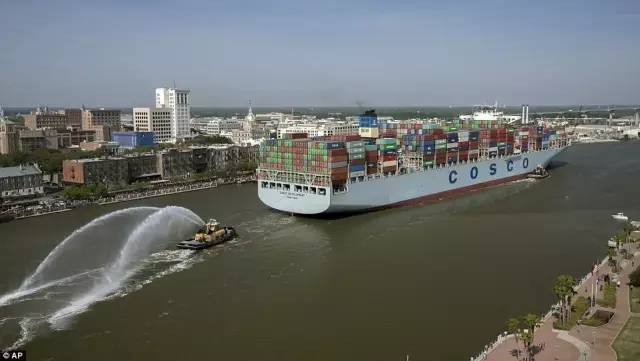“中远发展”货轮可搭载1.3万个约6米长的集装箱,负载量比去年夏天抵达萨凡纳港的上一艘打破纪录的巨轮还要大出30%。