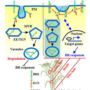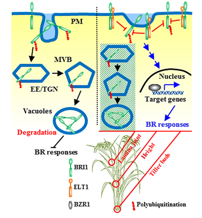 薛红卫研究组重点研究蛋白修饰及调控参与植物激素作用的机理。通过对水稻突变群体中叶倾角异常材料的筛选,他们鉴定了一个叶倾角增大、分蘖增多、株高降低的材料,遗传分析发现其表型是由于一个水稻特异的类受体蛋白ELT1的表达增多并增强了BR信号所致。ELT1虽然具有蛋白激酶区域,但其缺乏激酶活性,是一个非典型的类受体蛋白。进一步的分析表明ELT1直接与BRI1相互作用,通过互作抑制了BRI1的泛素化及其介导的内吞,导致BRI1的积累及增强的BR信号。这些结果鉴定了一个新的类受体蛋白并阐明了其调控水稻生长发育的机制,不仅有助于阐释单子叶植物中油菜素甾醇的信号调控机制,也为作物改良提供了重要线索,同时也揭示了非典型类受体蛋白参与调控膜蛋白内吞并介导相关信号的新机制。