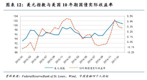 在美国新政府的财政政策愿景中,最吸引人眼球的便是减税和基建。市场憧憬扩张性财政政策将使得美国经济增长加速,并且拉动消费、投资和商品价格,实现“再通胀”,进而迫使美联储加息提速。目前的市场表现已经充分反映了对于未来财政政策的正面预期。如果财政刺激兑现,将使得美国经济增长提速,通胀水平走高,推高美元汇率,这将令非美货币包括人民币在内普遍承压贬值(见图表 12)。