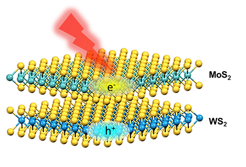 二维材料异质结是由不同的二维材料通过范德华力结合在一起的,两层之间的堆叠模式比较容易调控,进而可以得到多样的电子性质。二维材料异质结中光激发产生电子-空穴对在界面处发生空间分离的过程(简称分离过程)在很多光电效应和光伏应用中起着重要的作用。MoS22和WS22组成的异质结是第II类异质结:MoS22的价带顶(VBM)比WS22能量低,同时WS22的导带顶(CBM)要比MoS22高。由于MoS22的带隙要比WS22的小,实验上可以选择性地光激发MoS22中的电子-空穴对。由于能量差的原因,MoS22中激发的空穴会传导到WS22层中,从而实现电子-空穴的分离。超快激光实验(F. Wang et al. Nat. Nanotechnol. 2014, 9, 682)发现,这个分离过程能在50fs超快时间尺度发生。人们一般认为,界面处电子-空穴分离过程是取决于异质结的层间堆叠方式和层间相互作用,但是,层间堆叠模式与电子-空穴分离过程的定量关系却一直没有解决。