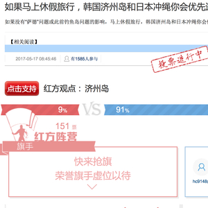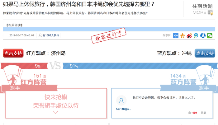 其实,对于这两个“暗中较劲”的海岛旅游地来说,中国网友的态度不能忽视。有网民表示,冲绳景点更多一些,有的还强调冲绳的历史,提到“琉球王国曾是中国的藩属国”。有的网民说如果优先选择济州岛而不是冲绳,“就是不想去一个曾侵略过伤害过中国,现在还跟中国对着干的那个国家”,但现在“萨德”问题出来后,也不会选择去济州岛。