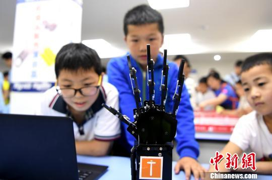 5月20日,参观者们实际操作机器人。 韩苏原 摄