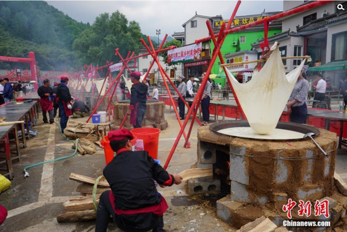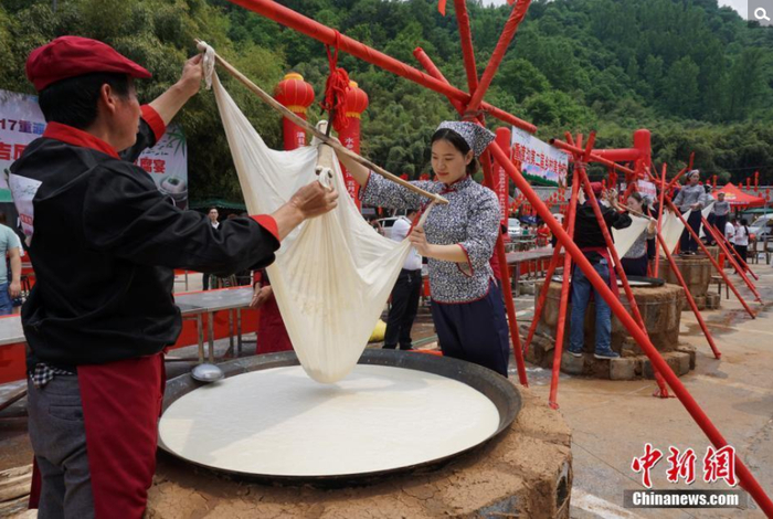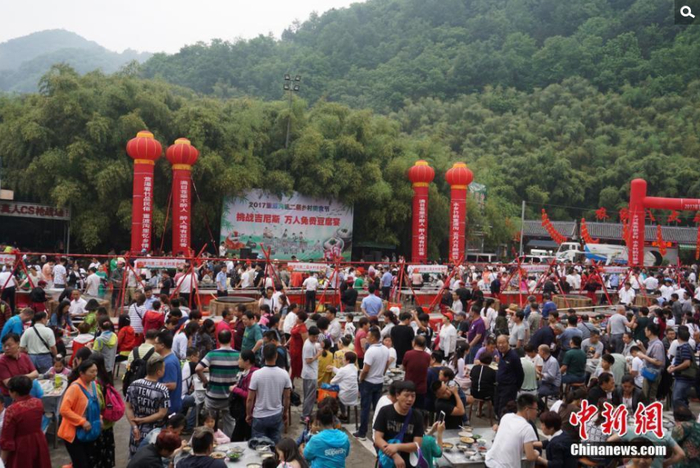 5月20日,河南栾川近万名游客在竹林环绕的大山里集体吃豆腐。豆制品被制作成豆花、豆腐、豆渣饼等,免费供游客品尝,场面甚为壮观。贾亲亲/中新网 摄