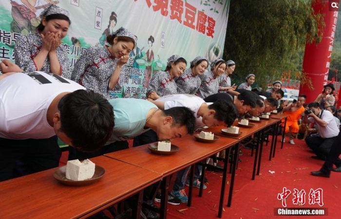 男子组参赛游客正在狼吞虎咽地吃一块一斤重的豆腐。