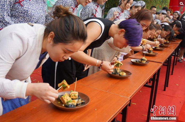 女子组进行吃臭豆腐比赛。