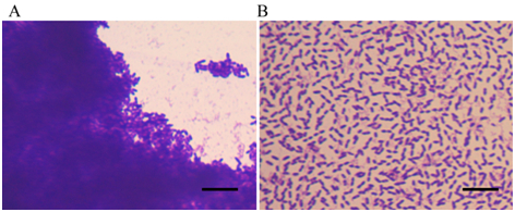 图3 野生型菌株RN12(A)和菌胶团缺失突变株(B)显微观察(放大1000倍,标尺为10微米)