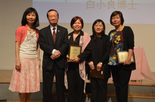 第二届“粉红丝带”介绍民众乳癌的知识及新疗法,左起角声癌症协会主任危楚菱、角声福音广场总监陈炽、黄丽芬、余亚箐、白小良。(记者牟兰/摄影)