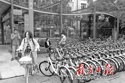 | 在广州鹭江地铁站,共享单车停放在地铁站出入口前10米范围以内的人行道上。南方日报记者 符超军 摄 |