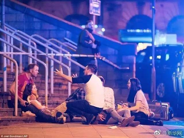 ▲几名在爆炸中受伤的人,坐在曼彻斯特体育馆外的台阶上。