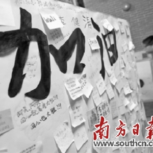5月22日,高考倒计时15天。晚上10时,当很多人已进入梦乡之时,中山市实验中学仍灯火通明。高三楼的走廊里,摆放着几张桌子,有人在静静地做着英语题,有人在小声地讨论着数学题,全然不顾来回走过的人,还有那大雨打着铁栏杆发出的“噼里啪啦”声响。