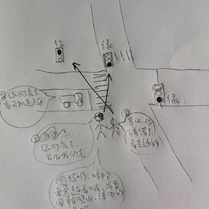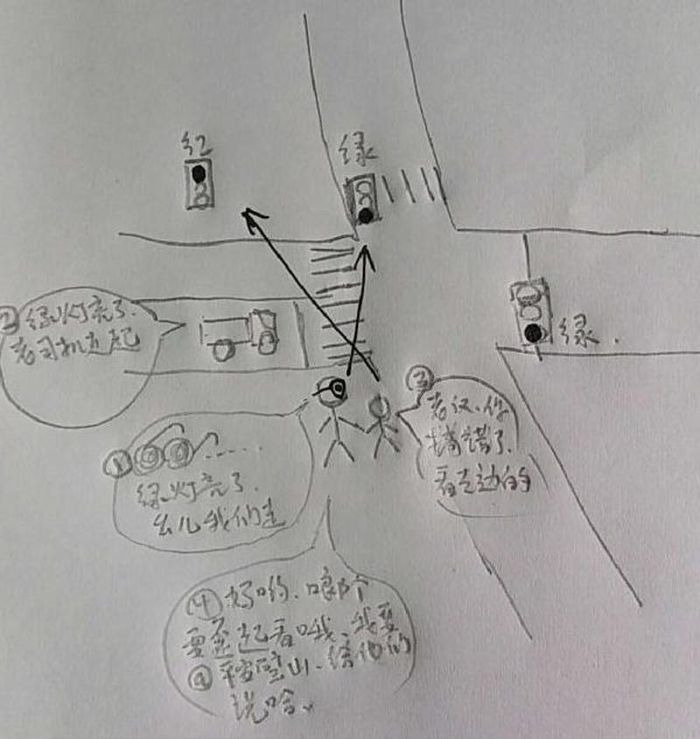 5月22日,星期一,一位名叫“不过如此”的网友向平安璧山微信号发去一条投诉:“我今天闯了红灯,原以为是绿灯,我走过去,车也开过来,我跟该司机对视了几秒警告他。结果是我闯了红灯,我退回去,路边等绿灯的几个人也以为是绿灯准备过去。”该网友还附上自己画的图。