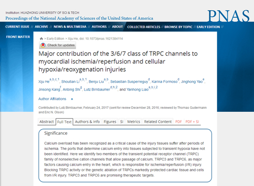 新闻网讯(通讯员 尹燕华)5月19日,《美国科学院院报》(Proceedings of the National Academy of the Sciences of the United States of America, PNAS)在线发表了基础医学院解剖学系廖燕宏教授团队关于心肌缺血再灌注损伤发病机制的研究成果。论文题目为《TRPC3/6/7对心肌缺血/再灌注损伤和细胞缺氧/复氧损伤的影响》(Major contribution of the 3/6/7 class of TRPC channels to myocardial ischemia/reperfusion and cellular hypoxia / reoxygenation injuries)。廖燕宏实验室与阿根廷天主教大学生物医学研究所Birnbaumer实验室共同合作完成本项研究。基础医学院2012级博士研究生贺细菊、2014级博士研究生李寿田为论文共同第一作者,Birnbaumer和廖燕宏为论文共同通讯作者。