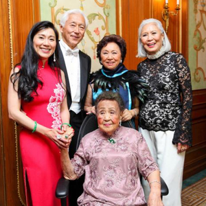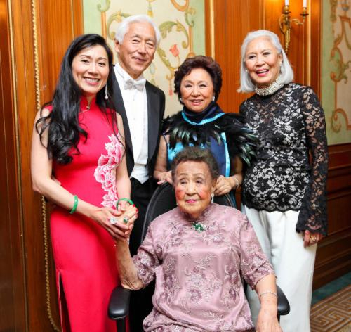 顾严幼韵(前排坐者)和家人庆祝109岁生日。来源:美国《世界日报》
