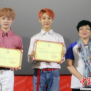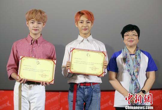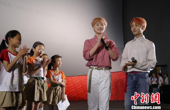 新生代音乐组合NCT DREAM中仁俊(中)和辰乐(左)两位成员助力“梦享教室”。 泱波 摄
