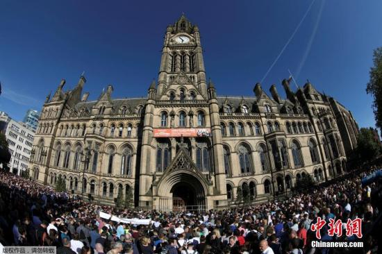 当地时间5月23日下午,数千名民众在曼彻斯特市中心举行集会,谴责曼彻斯特体育馆发生的恐怖袭击行为。
