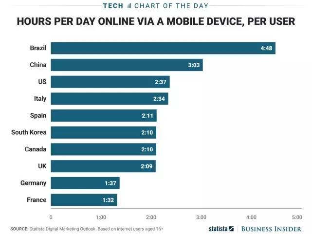 根据Statista的统计数据,在巴西,用户每天花费将近5个小时来玩手机,而中国用户排名第二,每天玩手机花费了3小时。