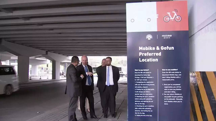 在停车场门口,设有“共享单车”推荐停车点,有不少消费者骑着“共享单车”过来开“共享汽车”。