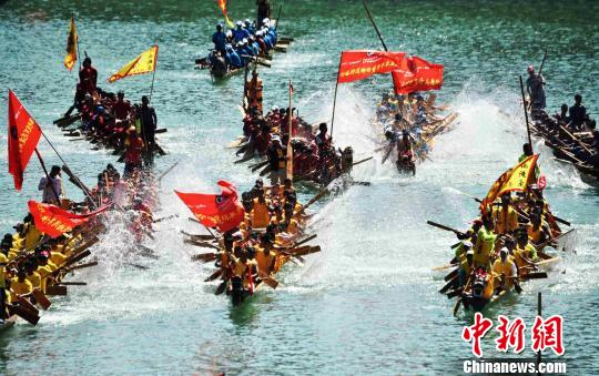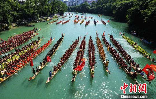 中新网碧江5月30日电 (王林成 杨云)30日,中国传统节日端午节。2017“大明边城杯”中国龙舟公开赛(贵州·铜仁·碧江站)暨中国传统龙舟大赛在贵州省铜仁市碧江区激情开赛。来自美国、俄罗斯、意大利、匈牙利等国家以及中国广东、广西、湖南、湖北、山东、重庆等省(直辖市、自治区)的99支男女龙舟队、4200余名龙舟健儿竞逐锦江。