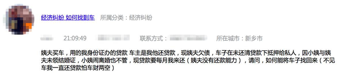 姨夫买车,用我身份证办的贷款,车主是我,他还贷款。现姨夫欠债,车子在未还清贷款下抵押给私人,因小姨与姨夫未领结婚证,小姨闹离婚也不管,现贷款要每月我来还(姨夫没有还款能力),请问,如何能将车子找回来吗?(不见车我一直还贷款怕车财两空)