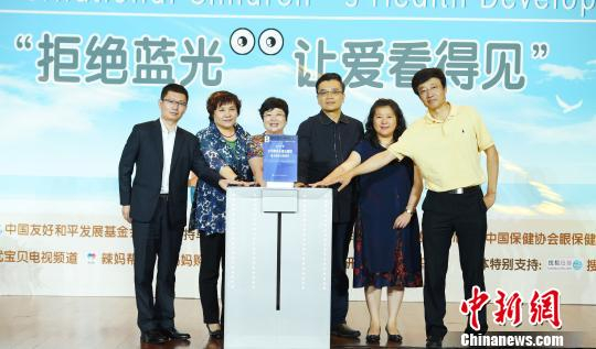 2017“六一国际儿童健康发展论坛”31日于北京举行,中国首个儿童视力蓝皮书《2017中国婴幼儿视力调查分析蓝皮书》于论坛中发布。图为与会的两岸嘉宾共同按下蓝皮书发布按钮。 毛冉 摄