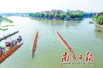 南方日报讯 (见习记者/许可 记者/李丹 通讯员/吴少敏)伴着急促的鼓点节奏,船桨整齐划一快速摆动,瞬间浪花四起……5月31日,2017年荔湾区龙舟邀请赛暨第52届龙溪沙溪龙舟景竞赛在花地河沙溪河段(佛山水道)开赛,24条广佛龙舟竞渡。