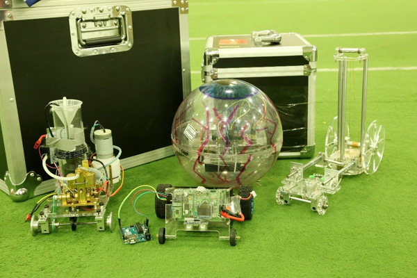三辆参赛小车与一辆备用小车(从左至右依次为:气动小车,电动自平衡小车,电动球形小车与双势能小车)