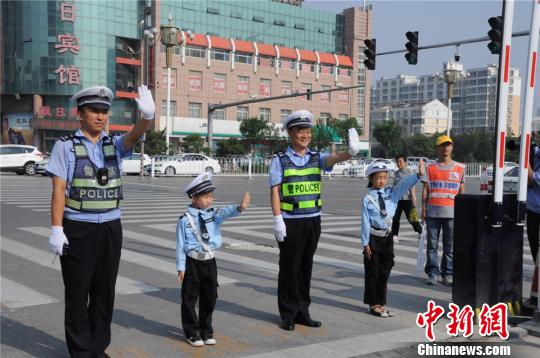河北邯郸“萌娃交警”儿童节陪妈妈指挥交通