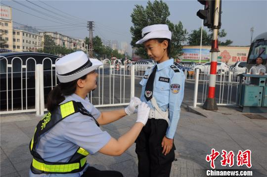 中新网邯郸6月1日电 为了让孩子们度过一个别样的“六一”国际儿童节,邯郸市交警支队当日专门安排了两名交警子女穿上特制的“小警服”,陪同妈妈共同对过往的非机动车进行管理和疏导。“萌娃交警”不仅学习了交通指挥手势,还观看并学习了黄色禁停标线等交通标志标线。