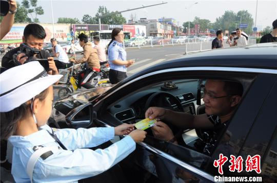 “萌娃交警”向过往车辆发放安全行车卡片。 韩波 摄