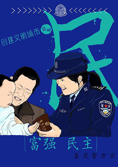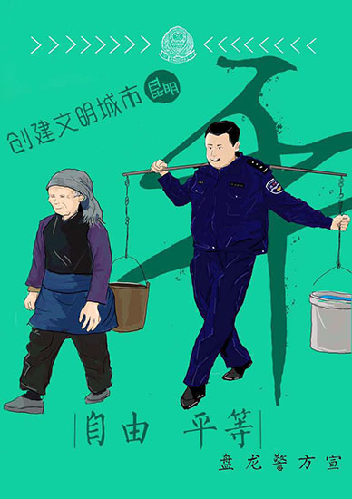 据悉,该组画作由盘龙公安分局龙头街派出所民警常江为分局“创文”工作原创。画作以社会主义核心价值观为题,同时以“讲文明树新风”,结合盘龙警方的工作进行创作。