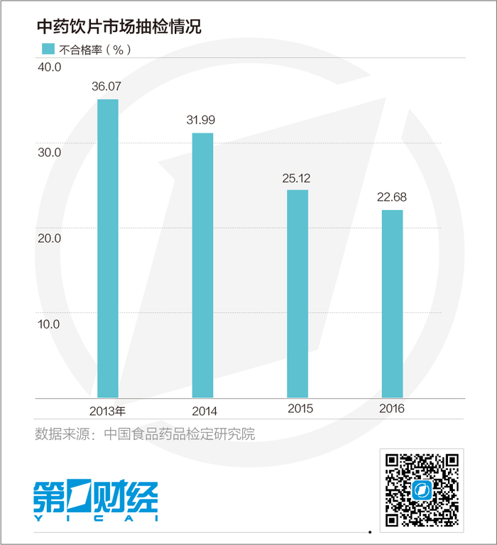 “2013~2016年全国药品质量抽验监测表明,中药材与饮片总体合格率分别为64%、68%、75%、77%,合格率呈逐年提升、稳步向好的趋势。但相对于其他药品,中药材及饮片的不合格率依然较高。”中国食品药品检定研究院(下称“中检院”)中药民族药检定所所长马双成对第一财经表示。