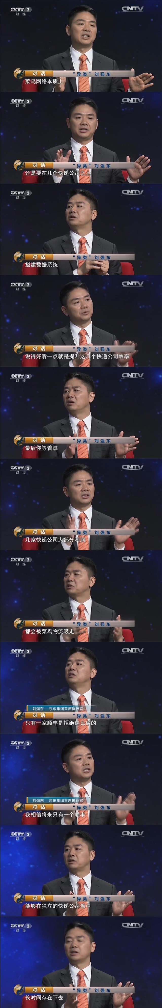 而在这场快递巨震背后,还有戏剧化的一幕:这条占据媒体头版的新闻,早在一年前就被预言帝刘强东看穿了!2016年7月17日,央视财经频道《对话》播出的 《“异类”刘强东》一期中,刘强东就曾提到:菜鸟网络本质上是在几个快递公司上搭建数据系统,几家快递公司的大部分利润都会被菜鸟物流吸走。今天,战事再次升级!京东力挺顺丰,宣布全面接入丰巢。快递巨头之争,对咱老百姓有何影响?快看!