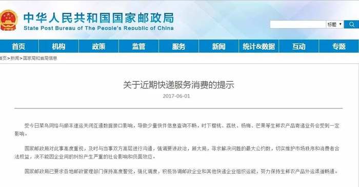 但对于普通消费者来说,不能因为两家公司对掐而影响公众利益。针对此事,国家邮政局昨日连夜发布《关于近期快递服务消费的提示》一文,该文称,受6月1日菜鸟网络与顺丰速运关闭互通数据接口影响,导致少量快件信息查询不畅,时下樱桃、荔枝、杨梅、芒果等生鲜农产品寄递业务会受到一定影响。