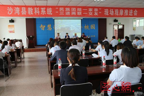 亚心网讯(通讯员 杨普)初夏六月,绿树林荫,温馨怡人。6月2日上午,新疆沙湾县教科系统“民族团结一家亲”暨“三进两联一交友”现场观摩推进会在沙湾三中隆重举行。沙湾县县委常委、宣传部部长柴红华、县民宗委书记高磊、县教科局局长谈新明、县教育督导室负责人叶予洲等领导出席,来自全县35所中小学、幼儿园近100多名领导和骨干教师前来参加。