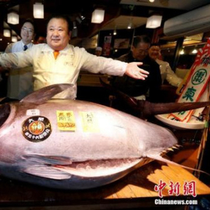 中新网6月2日电 据日媒报道,2013年在东京筑地市场举行的当年首次拍卖中,日本青森县大间产的重达222公斤的蓝鳍金枪鱼以1.5540亿日元(约合人民币950万元)成交。该金枪鱼被吉尼斯世界纪录认定为“竞拍成交的最高价金枪鱼”。