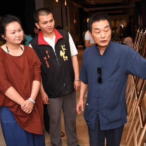 跨海前来参加闽台民俗信仰符箓展的台湾中华道教法师联合总会理事游传芳(右一),向福州玉勅弘圣堂管委会主任林志军(左二),台湾传统文化促进会理事邓萍(左一)介绍其专程从台湾新北市太虚宗师府带来的符箓展品。 记者刘可耕 摄