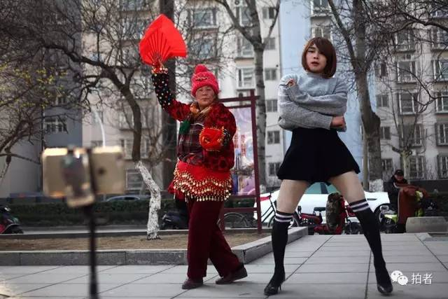 △ 2017年2月11日,徐州,一位穿着红花大棉袄、戴着红帽子的大妈在和穿女装的95后网络男主播“斗舞”。