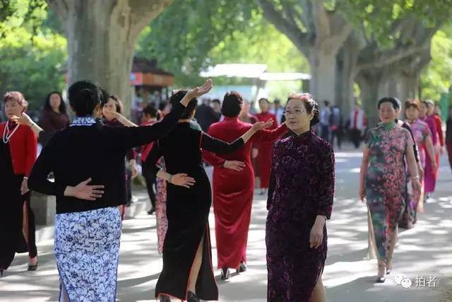 △ 2017年4月18日,郑州人民公园,大妈们穿着风格各异的旗袍在广场上翩翩起舞。