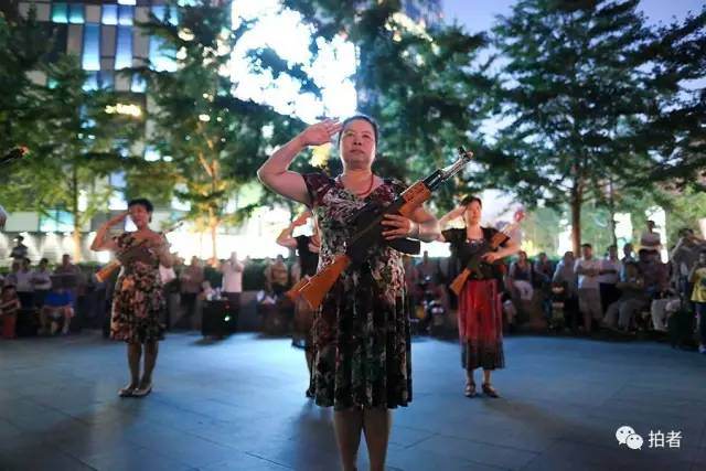 △ 2014年6月27日,北京东直门,大妈们表演“杀鬼子”广场舞。