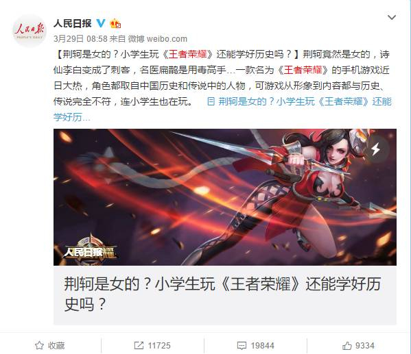 @人民日报 官方微博就曾转发光明日报的文章《荆轲是女的?小学生玩〈王者荣耀〉还能学好历史吗?》,该认为《王者荣耀》用历史人物作为游戏角色,但却和历史背景、人物经历并无挂钩,内容和精神被架空,有名无实。