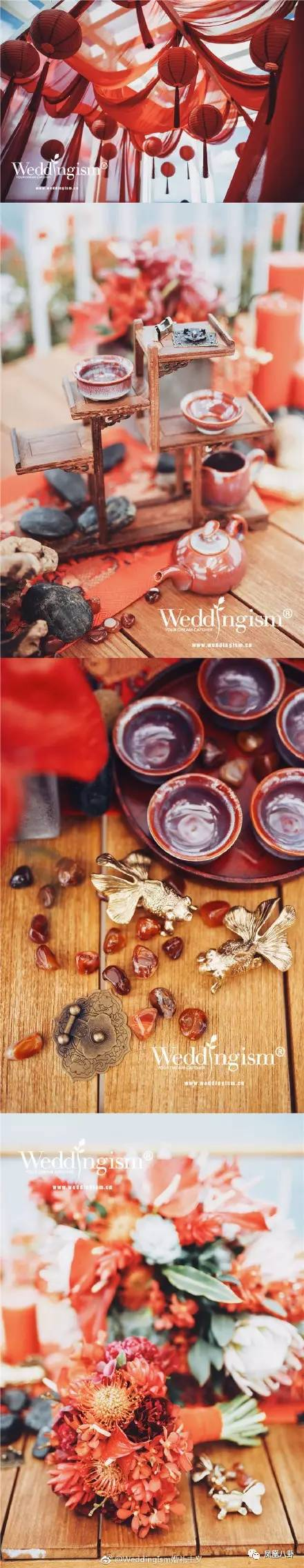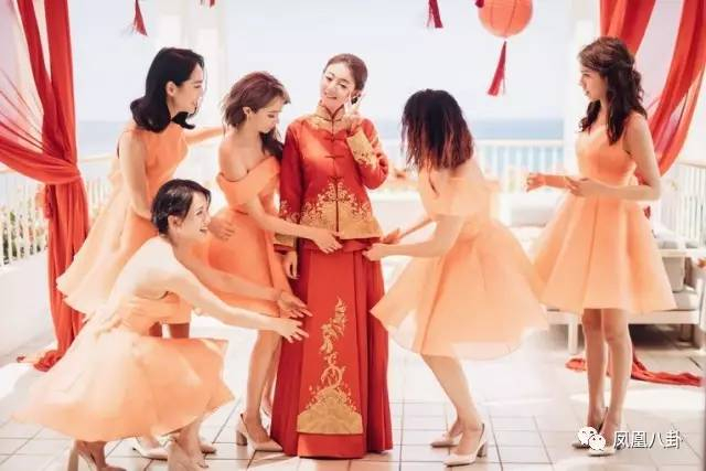 新娘亲自设计十伴娘穿橘色短洋装,是在海边显得俏皮可爱,也呼应今天婚礼dress code马卡龙色,新人中式衣服是安以轩自己设计,绣了金鱼,意味金玉满堂。
