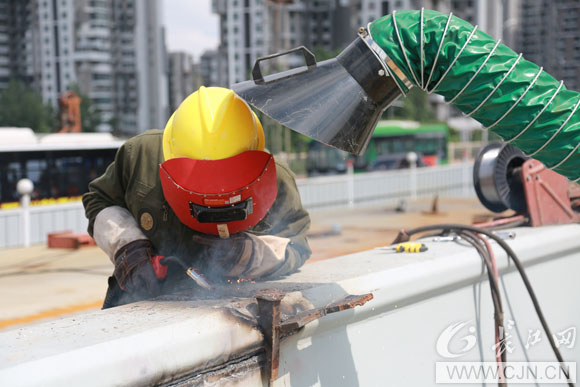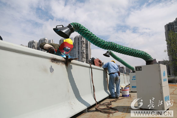 记者在光谷有轨电车T1线跨南环铁路桥梁施工现场看到,每个电焊工人作业的旁边,均放置了一台类似抽油烟机的设备,该净化器底部装有四个带制动的万向滑轮,能够在工作场地自由移动,使用非常方便。