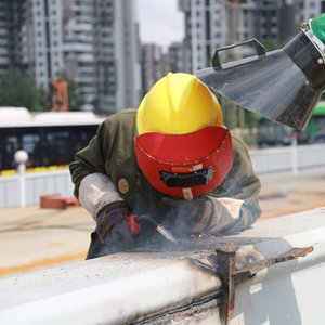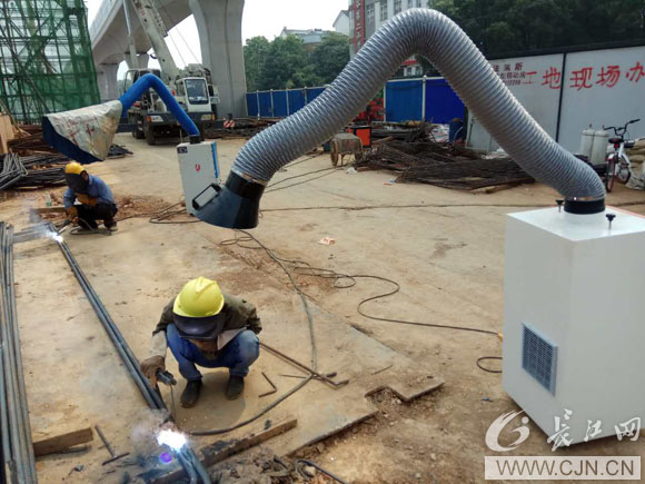 据施工方市政集团现场负责人介绍,电焊是建设工地上较为常见的作业。电焊过程中,在产生火花的同时,也会冒出一些烟尘。在高温燃烧情况下产生的,这种烟尘中含有二氧化锰、氮氧化物、氟化物、臭氧等,飘浮在空气中对人体有害。该设备通过风机引力作用,烟尘经过万向吸尘罩、吸气臂、吸尘软管吸入设备进风口,通过高效滤芯和活性炭过滤器进行双重净化后,变成洁净空气向外排出。这对电焊工人起到保护作用的同时,能够有效降低空气污染。这种设备净化率达到99.9%,能够有效净化电焊时产生的悬浮在空气中的细小金属颗粒,而且使用时噪音低。