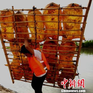 图为筏子客将羊皮筏子拖出水面。 郭红 摄