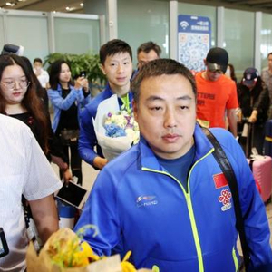 6月7日,中国乒乓球队总教练刘国梁(前)抵达北京首都国际机场,球迷热情迎接。在本届世乒赛上,中国队囊获了男女单打与男女双打共四个项目的冠军。 中新社记者 卞正锋 摄