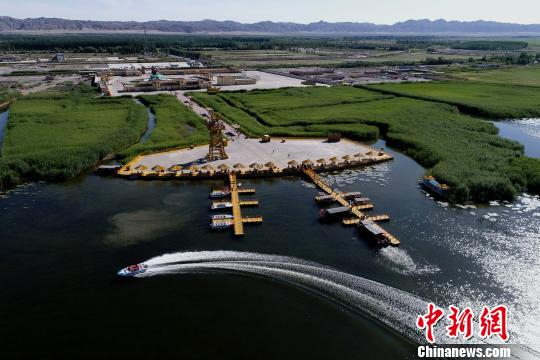 在新疆博斯腾湖大河口(西海渔村)景区,游客乘坐水上摩托体验水上项目的乐趣。 年磊 摄