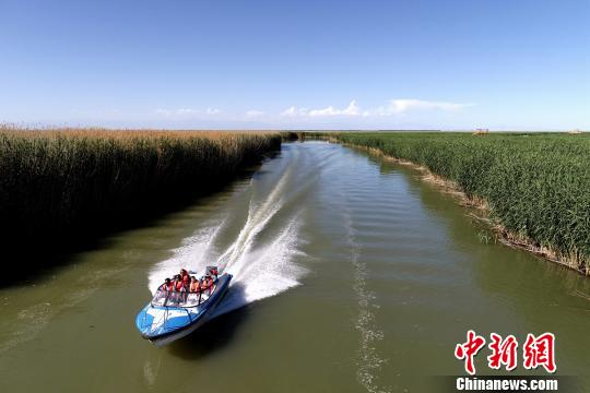 在新疆博斯腾湖阿洪口(莲海世界)景区,游客乘坐快艇穿越芦苇荡,体验水上项目的乐趣。 年磊 摄